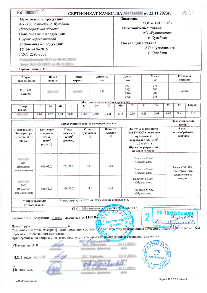 20Х13, 08Х18Н10Т, 14Х17Н2, ЭИ696, ЭП288, ЭИ943, ЭП56, ЭП609-Ш, ЭИ961-Ш, ЭИ835-Ш, ЭП517-Ш, ЭП866-Ш, ЭИ811-ВД, ЧС68-ИД, ЭИ847-ИД