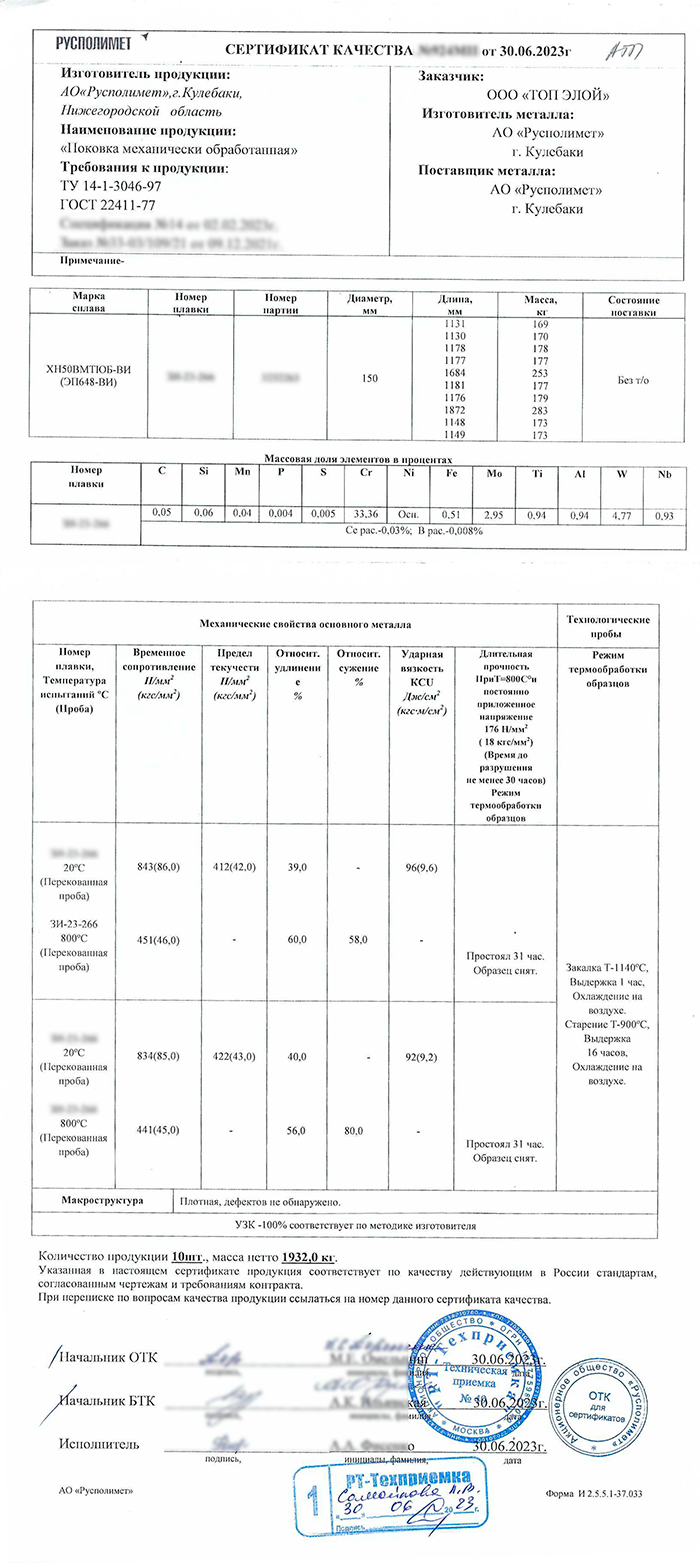 20Х13, 08Х18Н10Т, 14Х17Н2, ЭИ696, ЭП288, ЭИ943, ЭП56, ЭП609-Ш, ЭИ961-Ш, ЭИ835-Ш, ЭП517-Ш, ЭП866-Ш, ЭИ811-ВД, ЧС68-ИД, ЭИ847-ИД